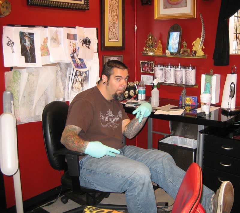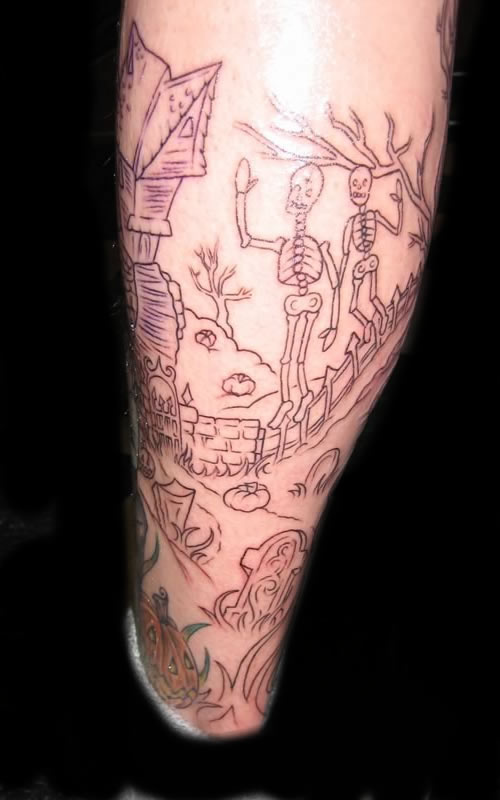 Chris got more work done on his Nightmare before Christmas leg sleeve and has the scars to prove it. I got a few little sailor sparrows–pics will come after we are done whining about the itchiness and soreness (and yes, that’s from the TATTOOS, not any other sort of debauchery–get yer minds out the gutter!).